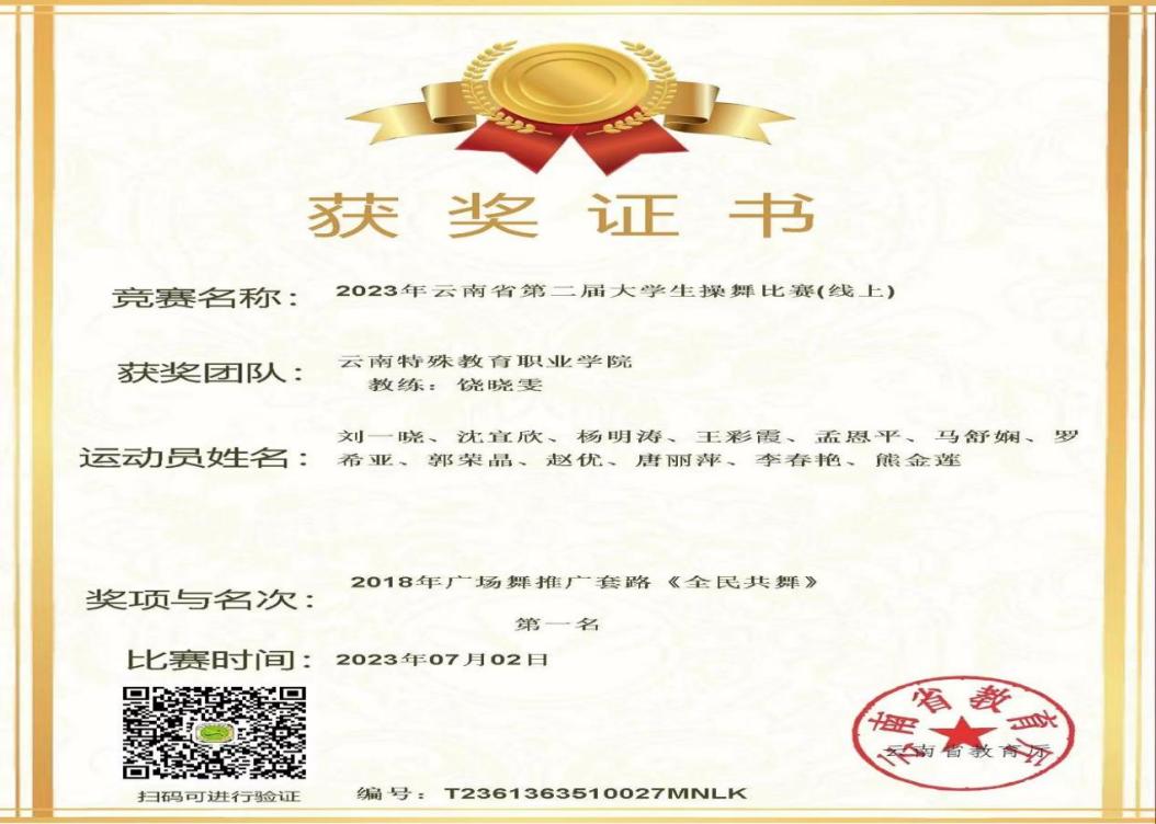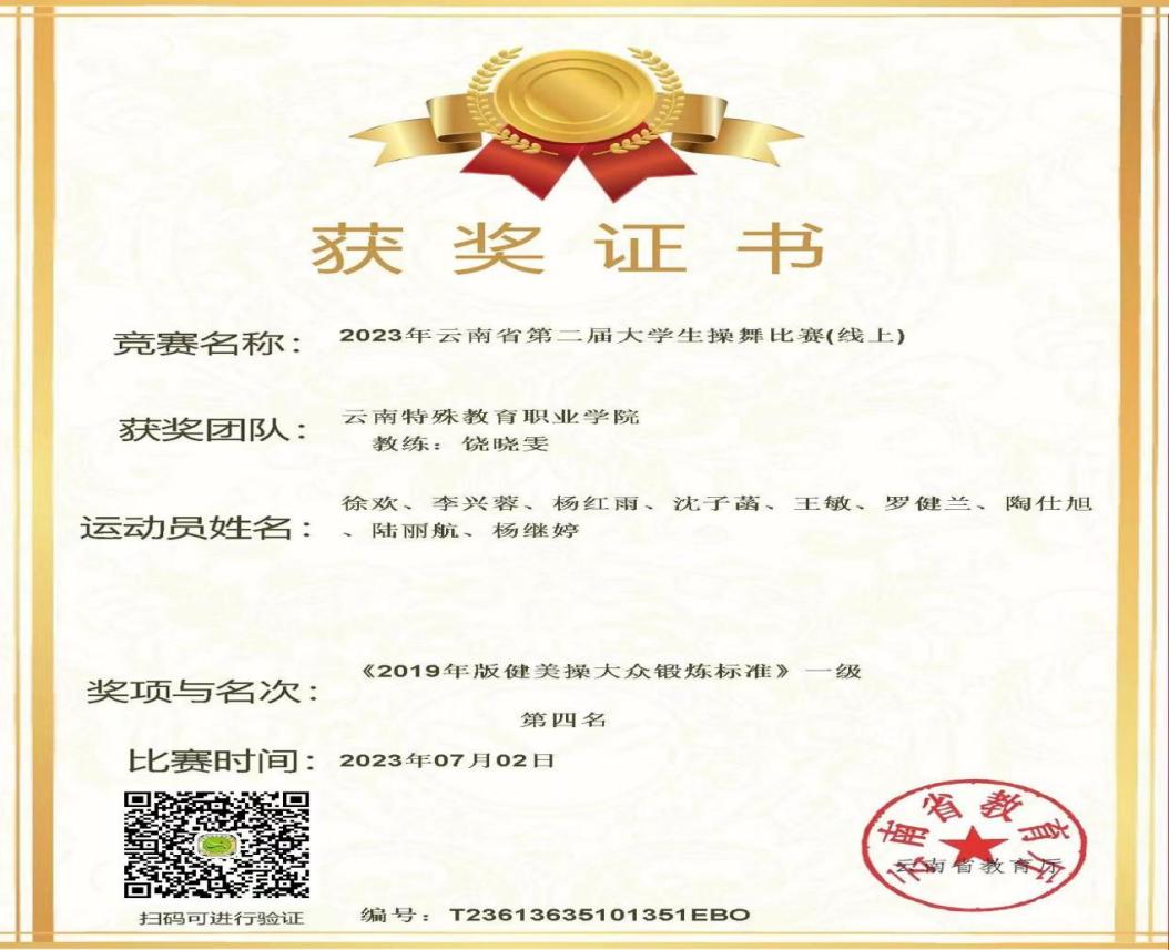 此次比赛,在指导教师的精心指导下,在队员们的共同努力下,大家锐意进取,不断克服各种困难,最终取得了喜人成绩。“2018年广场舞推广套路《全民共舞》”荣获第一名、“《2019年版健美操大众锻炼标准》一级”荣获第四名。