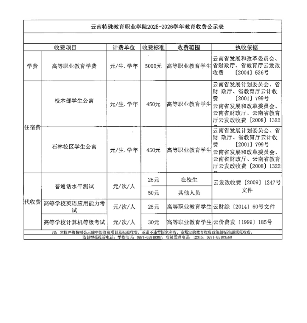 云南特殊教育职业学院2025-2026学年教育收费公示表