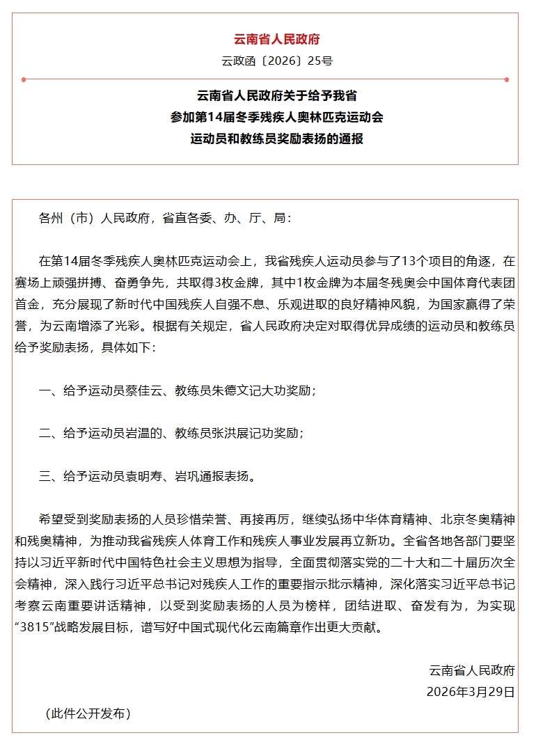 3月29日,云南特殊教育职业学院岩温的、袁明寿、岩巩三位校友带着在第14届冬季残疾人奥林匹克运动会赛场上顽强拼搏、奋勇争先的奖牌荣誉归来,他们为国家赢得了荣誉,为云南增添了光彩。被云南省人民政府给予奖励表扬。