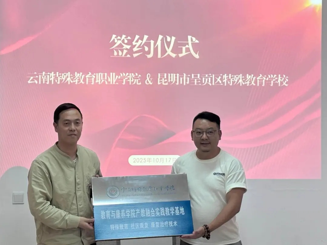 10月17日,我校教育与康养学院和昆明市呈贡区特殊教育学校举行教师产教融合校企合作签约仪式。旨在深化协同育人机制,构建“院校协同、资源共享、实践共育”的特殊教育人才培养新模式,为云南省特殊教育事业高质量发展注入新动能。