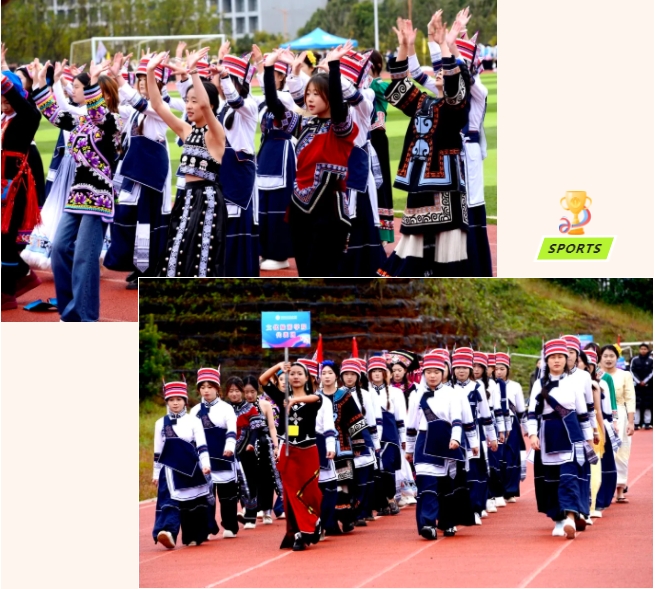 文化旅游学院方阵,踏民族风情而来——盛装绣纹裹着热忱,既是“空中纽带”,也是“文旅使者”;跑道作“起飞赛道”,让民族风情、民航精神,随每步冲刺绽在赛场。
