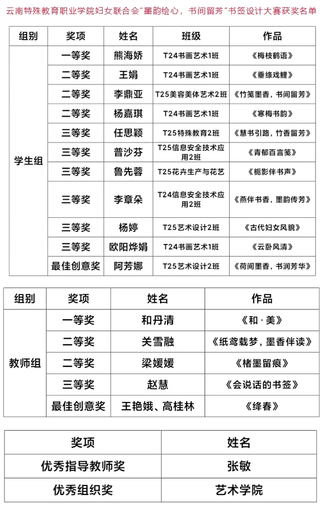 近日,我校妇联举办的“墨韵绘心,书间留芳”书签设计比赛圆满落下帷幕。本次比赛以小小的书签为载体,为师生搭建了一个展现艺术才华、传递阅读情怀的平台,吸引了众多师生踊跃参与。