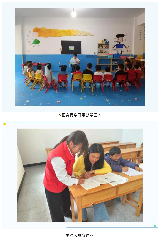 学子们发挥专业优势,将温暖陪伴与专业指导融入少年儿童成长之路,用爱心守护童心。T24特教三班李正合走进鲁甸县苏莱曼幼儿园,针对中班幼儿的成长特点,开展生活自理能力指导与趣味集体游戏活动,将特殊教育的专业教学方法融入日常教学,耐心引导幼儿自己穿衣、整理玩具;在游戏中培养幼儿的合作意识与社交能力,让孩子们在快乐中学习、在陪伴中成长;同班级的李桂云则扎根社区,为孩子们开展寒假作业辅导实践活动,通过益智游戏巩固知识、户外体育活动增强体质、传统文化体验传承经典,用温柔的陪伴和丰富的活动,填补孩子们的假期空白,传递教育的温暖与力量。