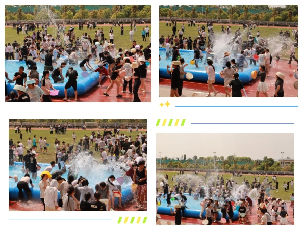 15:00,泼水狂欢在中心足球场开启。校园提前搭建大型蓄水池、准备洁净用水及泼水工具,师生相互泼洒吉祥清水,现场欢声笑语、氛围热烈,传递着友爱与祝福。