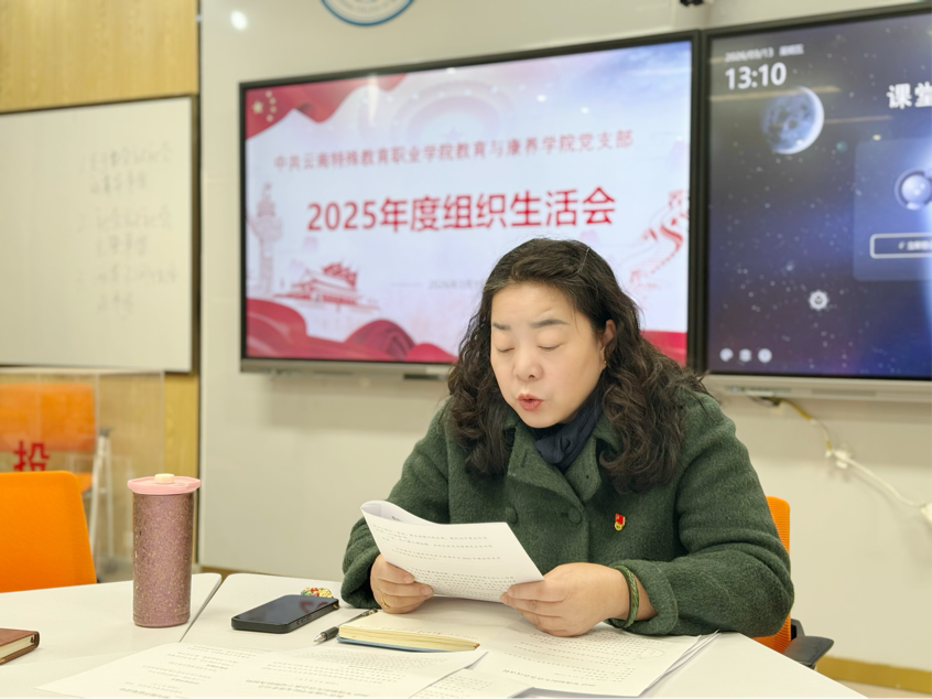 为深入学习贯彻习近平新时代中国特色社会主义思想,牢牢把握树立和践行正确政绩观学习教育总要求,3月13日,教育与康养学院党支部召开2025年度组织生活会。会议由党支部书记邓迎主持,学院党支部全体党员参会,预备党员以线上形式同步参会,对口联系校领导石安银同志到会指导并点评。